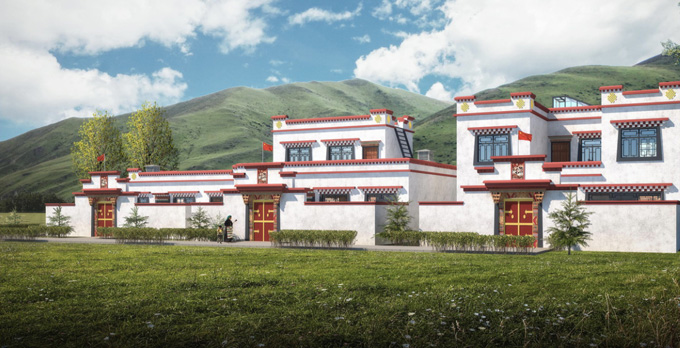 在立面整體設(shè)計上,采用現(xiàn)代藏式風(fēng)格,各個建筑單元機(jī)理均勻、有序、連續(xù)、勻稱,韻律,漸變效果很明顯。有整體感,虛實結(jié)合,飽滿而豐富,延續(xù)了村莊的建筑機(jī)理和界面,結(jié)合原有建筑成為新的視點。